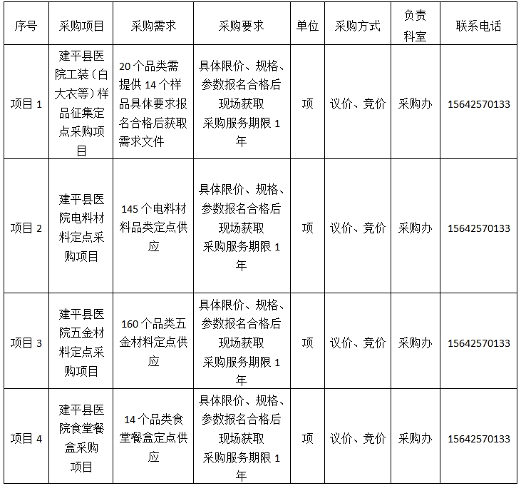 2.项目名称:建平县医院工装(白大衣等)样品征集定点采购项目、建平县医院电料材料定点采购项目、建平县医院五金材料定点采购项目、建平县医院食堂餐盒采购项目