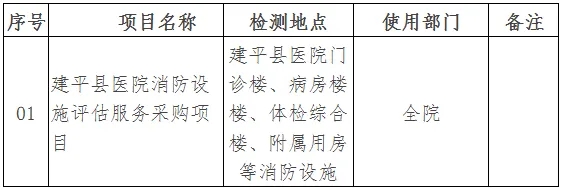 建平县医院就门诊楼、住院楼、体检综合楼及附属用房消防评估服务项目进行院内采购,欢迎符合资格条件的供应商参加竞标。有关事项如下: