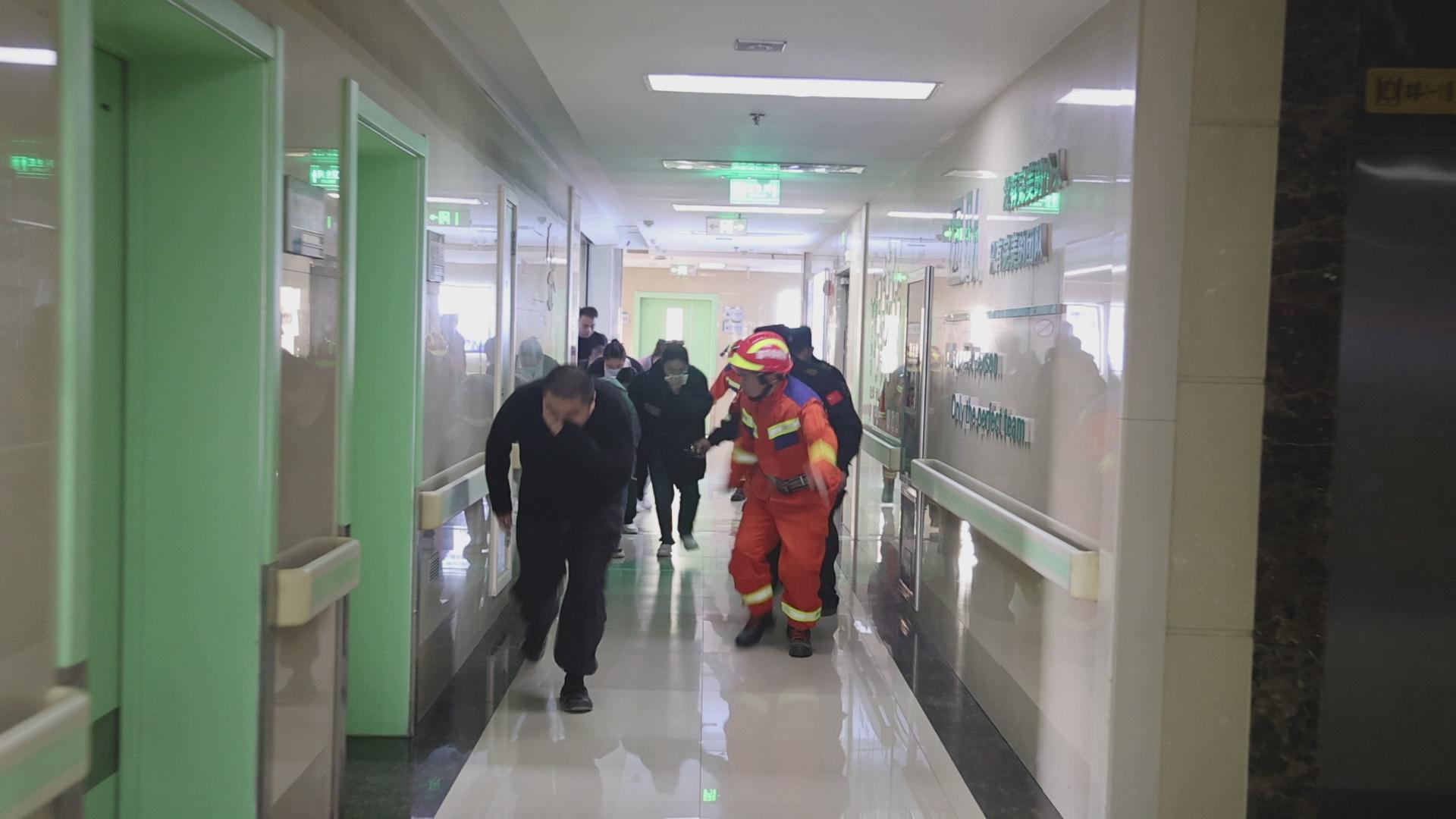 演练模拟住院部10楼发生火情,随着警报响起,消防应急演练正式拉开帷幕。火情现场浓烟弥漫,并有人员被困,情况万分危急,医护人员立即启动院内报警系统,并迅速拨打“119”消防救援电话。消防监控室人员第一时间到达现场进行紧急处置,在利用消防设施进行初期扑救的同时,快速协助医护人员组织病区患者通过就近的疏散通道、弯腰低姿、用湿毛巾捂住口鼻,紧张有序地向安全区域撤离。