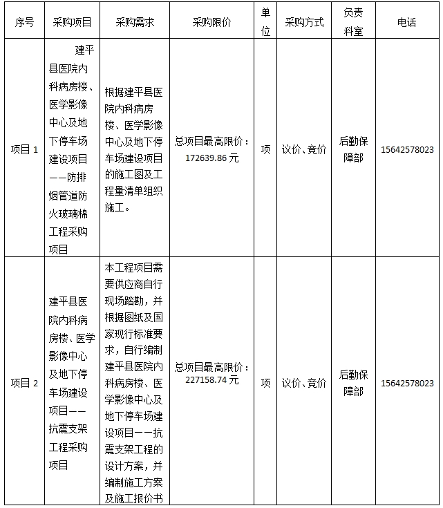建平县医院内科病房楼、医学影像中心及地下停车场建设项目——抗震支架工程采购项目,和建平县医院内科病房楼、医学影像中心及地下停车场建设项目——防排烟管道防火玻璃棉工程采购项目征集服务供应商。欢迎符合资质要求的单位参与议价、竞价会议。相关事项具体如下: